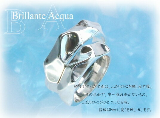 送料無料ペアリング Brillante Acqua価格: 9,900円レビュー評価: 5.0 レビュー数:1 「Brillante Acqua」というイタリア語は、「輝く水」という意味。揺れる水面のような立体感が光を反射し、細めですが存在感のあるペアリングです。メンズとレディースを並べると1箇所だけハートになるデザインには、「澄んだ水面は揺れても、想い(ハート)は揺るがない」というメッセージが込められています。専用巾着、ショッピングバッグ付き。※表示価格はペアセット価格です。カジュアルなペアリングで、単体で着けてもなかなかハートとは気が付かないデザインです。 内側の刻印も無料で承ります。大文字ブロック体英数字&各6文字以内 素材 シルバー 石 刻印 刻印可、お買いものかご内備考に記入、大文字ブ |